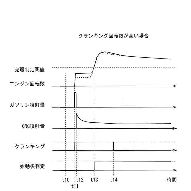 図5は、本発明の一実施例に係るバイフューエル車両における内燃機関の再始動時のクランキング回転速度が低い場合の車両状態の推移を示すタイミングチャートである。
