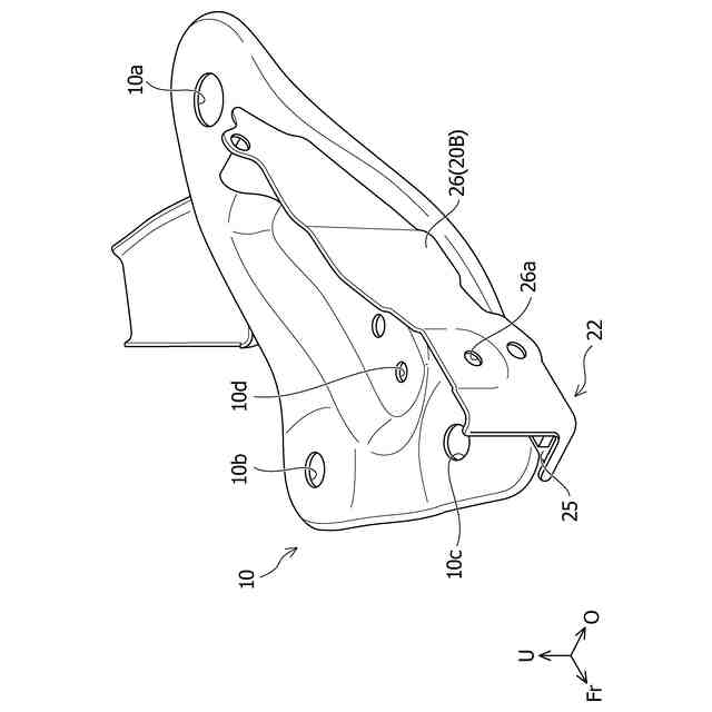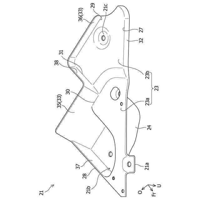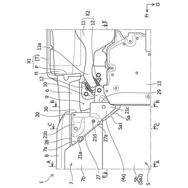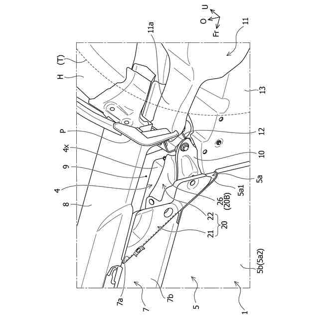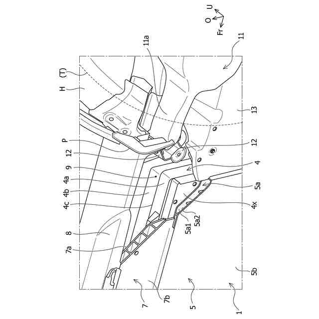 以下、本発明の実施の形態について添付図面を参照して説明する。図1は本発明の一実施形態に係る車体下部構造1を含む車体の下面図であり、図2は車体下部構造1の要部の拡大下面図であり、図3は図2に示されたA-A線における断面図である。なお、図において、矢印Fr方向は車両前後方向で前方を示し、矢印O方向は車幅方向で車両外方を示し、矢印U方向は車両上下方向で上方を示している。以下の説明における「前」及び「後」は車両前後方向における前及び後に対応し、「上」及び「下」は車両上下方向における上及び下に対応し、「左」及び「右」は車内の乗員が車両前方を向いた状態での、車幅方向における左及び右に対応している。車体下部構造1は左右対称の構造を有しており、以下では、主に車体下部構造1の左側の部分について説明し、車体下部構造1の右側についての説明は省略する。車体下部構造1が適用される車両は、電気自動車又はエンジン及びモータを併せ持つハイブリッド自動車であり、本実施形態では、特に限定されるものではないが、電気自動車である。