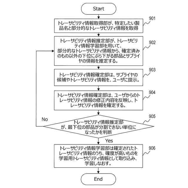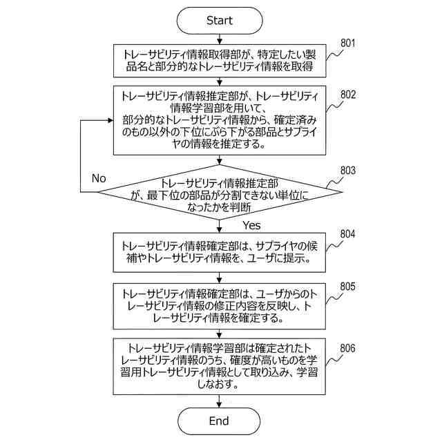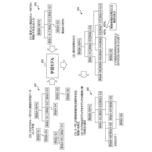 【解決手段】トレーサビリティ情報作成支援システムであって、プロセッサと、記憶装置と、を備え、記憶装置は、物品と、当該物品を構成する物品及びそのサプライヤとの関係を学習したモデルを保持し、プロセッサは、物品と、当該物品を構成する少なくとも一つの物品及びそのサプライヤとの関係を示すトレーサビリティ情報の入力を受け付け、モデルを使用して、入力されたトレーサビリティ情報において不足している1以上の物品及びそのサプライヤを推定し、推定された1以上の物品及びそのサプライヤをユーザによる確認のために出力し、ユーザによって確認された1以上の物品及びそのサプライヤを確定したトレーサビリティ情報として記憶装置に格納し、確定したトレーサビリティ情報を学習することによってモデルを更新する。