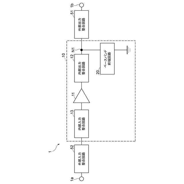 特許文献1は、パッケージに収納されたRFパワーデバイスを開示する。RFパワーデバイスは、少なくとも一つのトランジスタ、RF信号入力リード線、RF信号出力リード線、出力マッチング回路、およびビデオバイパス回路を備える。RF信号入力リード線およびRF信号出力リード線は、トランジスタに結合されている。出力マッチング回路はRF信号出力リード線に結合されている。トランジスタは、出力マッチング回路を介してRF信号出力リード線に結合されている。ビデオバイパス回路は、出力マッチング回路を介してRF信号出力リード線に結合されている。