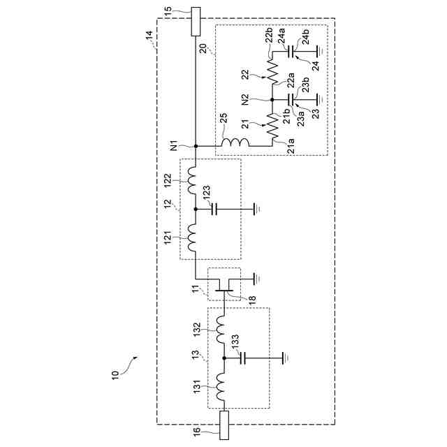 最初に、本開示の実施形態の内容を列記して説明する。[1]本開示の一実施形態による増幅回路は、アンプ、第1抵抗、第2抵抗、第1キャパシタ、および第2キャパシタを備える。アンプは、高周波信号を増幅し、増幅した高周波信号を出力端子に出力する。第1抵抗は、第1端および第2端を有する。第1抵抗の第1端は、アンプと出力端子との間の配線に接続されている。第2抵抗は、第1端および第2端を有する。第2抵抗の第1端は、第1抵抗の第2端に接続されている。第1キャパシタは、第1電極および第2電極を有する。第1キャパシタの第1電極は、第1抵抗の第2端と第2抵抗の第1端との間のノードに接続されている。第1キャパシタの第2電極は基準電位に接続されている。第2キャパシタは、第1電極および第2電極を有する。第2キャパシタの第1電極は、第2抵抗の第2端に接続されている。第2キャパシタの第2電極は基準電位に接続されている。