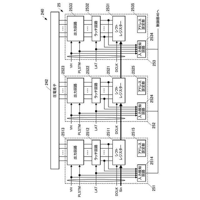 インクを吐出するノズル及び圧電素子を複数有するヘッドの所定の圧電素子群に接続され、当該圧電素子群を駆動する集積回路を複数備え、