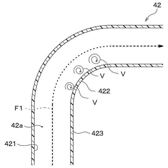 ただし、溝が形成されることによって表面形状が変化する部位に沿って空気が流れると、渦の発生に起因する音とは別の音が発生する虞がある。これに対して、複数の溝の配列、形状および数量のうち少なく1つを空気流れ方向に沿って変化させることで、内壁面における溝が形成される部位の表面形状を空気流れ方向に沿って徐々に変化させることができる。このため、内壁面における溝が形成される部位の表面形状の急激な変化を抑制できる。したがって、内壁面における溝が形成される部位に沿って空気が流れることによって発生する音の大きさを抑制することができる。したがって、圧力損失を増加させることなく、空気の流れに起因する音の大きさを低減することができる。