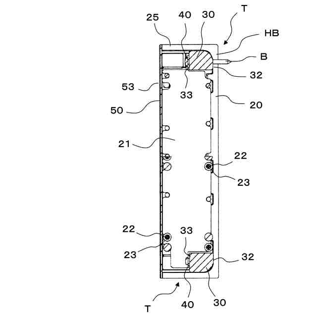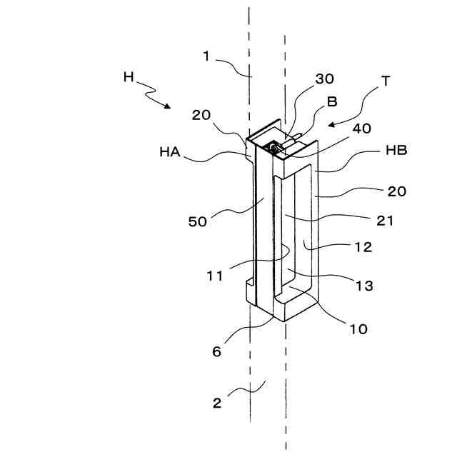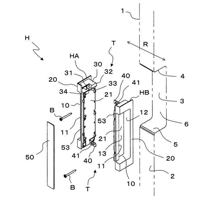 この従来の引戸用引手Haにおいては、引戸1としては厚さの異なるものが種々あることから、これに対応するために、一方引手部材110a及び他方引手部材110bの互いに対向する裏面側には、一方引手部材110a及び他方引手部材110bがこれらの凹部6の引戸の厚さ方向Rの間隔を調整可能に凹部6の底壁面3に1つのビスBにより取付けられる被取付手段120が設けられている。被取付手段120は、上下に一対設けられている。この被取付手段120は、一方引手部材110a及び他方引手部材110bの互いに対向する裏面に夫々設けられビスBの通る溝が形成された断面半円錐台状に形成された部分を有する一体成形された後側凸部121及び別体の前側凸部122と、これらの後側凸部121及び前側凸部122に夫々係合しビスBのねじ込みによって、一方引手部材110a及び他方引手部材110bをビスB側に引き寄せる断面傘型の一対の金具123,124とから構成されており、金具の引き寄せ程度によって、一方引手部材110a及び他方引手部材110bの間隔を調整して引戸の厚さに対応するようにしている。符号125は、一方引手部材110a及び他方引手部材110bの表面側でこれらに跨って設けられ、一方引手部材110a及び他方引手部材110bの間を覆う板状のカバーである。