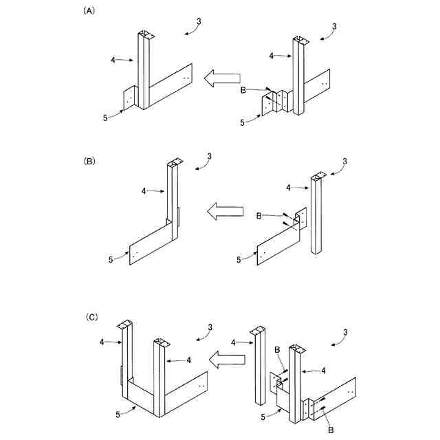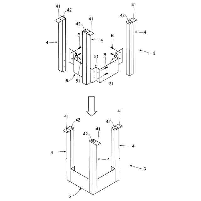 上記曲げ板部材と上記四角筒部材は別個の部材であり、上記曲げ板部材と上記四角筒部材とが締結部材によって立体的に組み立て可能であってもよい。これによれば、現場への資材搬送に際しては、上記曲げ板部材と上記四角筒部材を分離状態にして積荷空間を効率的に利用し、現場で上記曲げ板部材と上記四角筒部材とを締結部材によって立体的に組み立てることができる。