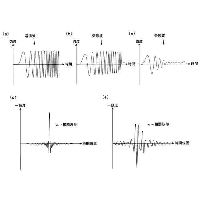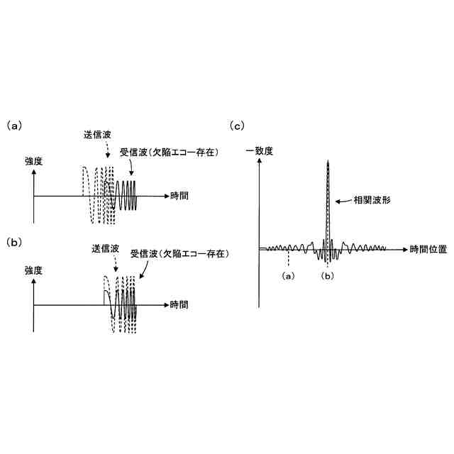 また、図1(c)に示す相関波形が算出される受信波に、送信波が被探傷材の内部に存在する欠陥で反射したことによって得られる欠陥エコーが存在する場合には、図1(c)に示す(b)の時間位置は、当該欠陥までの往復の距離に応じた時間位置に対応することになる。このため、被探傷材中の音速を予め調べておけば、相関の一致度の高い点の時間位置に基づいて、欠陥位置を検出することができる。また、相関波形の一致度の値は、欠陥エコーの大きさと正の相関を有するため、この一致度の大きさから欠陥エコーの大きさ、ひいては欠陥の寸法を推定することも可能である。