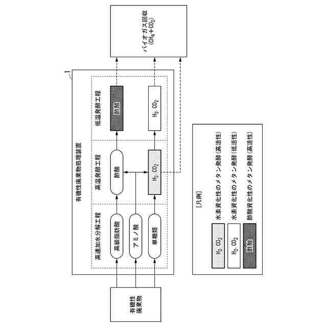 (1):この発明の一態様に係る有機物処理装置は、有機物を燃料ガスに転換する有機物処理装置であって、前記有機物と水とが混合した高温高圧の条件下で前記有機物を加水分解処理する加水分解処理装置と、前記有機物を発酵させることにより前記燃料ガスを生成する発酵槽と、前記加水分解処理装置の圧力を蓄積する圧力蓄積装置と、を備える有機物処理装置。