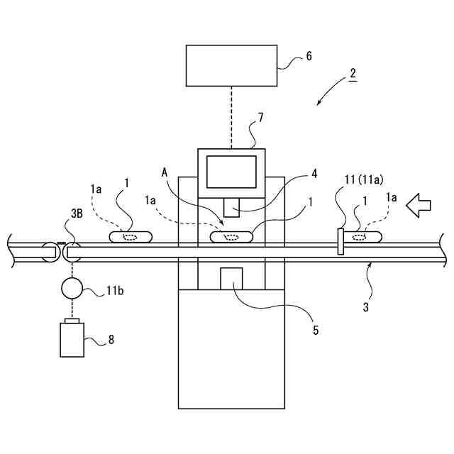 図1に示すように、上記照射手段4は搬送手段3の上方に設けられており、上記受光手段5は搬送手段3を挟んで上記照射手段4の下方に設けられている。この照射手段4および受光手段5の設けられた位置をおにぎり1の検査位置Aとする。