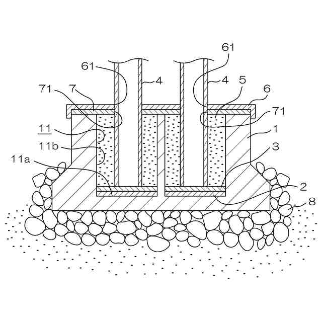 前記収容部の前記内側底面と前記内側側面と前記柱との間に充填された粒状物とを、
