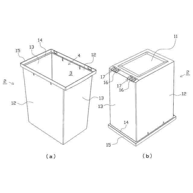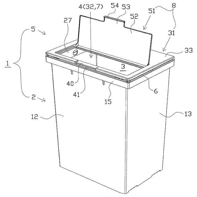 手段1によれば、容器に投入する物体(ゴミ)の大小や形状等に応じて、当該物体の投入に適した(必要最低限となる)容器本体の開口部の開口形状(開口面積)を確保するために開位置とさせる蓋体(第2蓋体を含む第1蓋体の全体、又は、第2蓋体のみ)を選択し、選択した蓋体を開位置とすることができる。特に、第2蓋体は第1蓋体に設けられているため、第1蓋体を開位置とすることで第2蓋体も付随して変位し、開口部の全体が開口される。つまり、開口部の全体を開口させる場合、及び、開口部の一部を開口させる場合のどちらも、1つの蓋体を開位置とする操作だけで済むことから、開口部を開口させる際の作業性及び利便性の向上等を図ることができる。また、第2蓋体だけを開閉させる場合に、開口部の全体を一度に開閉させる場合に比べて、開口部の開口面積を小さく、かつ、蓋体の開閉にかかる時間(ひいては、物体の容器への投入にかかる時間)を比較的短くすることができる。さらに、蓋体の開閉に際して容器に収容されている物体に悪影響が生じる(例えば、蓋体の開閉に際して発生した風によって容器に収容されている比較的軽い物体が浮き上がってしまう)ことを抑制することができる。結果として、状況に応じて蓋体を選択的かつ効率的に開閉させて、所望の使用形態とすることができ、利便性の向上等を図ることができる。