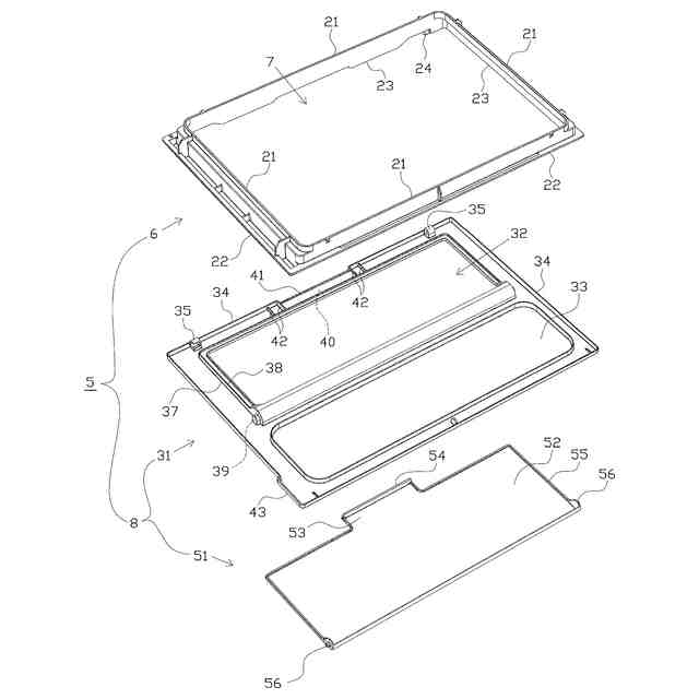 また、閉位置にある第2蓋体が第2中心軸から第1中心軸側に向けて延在するようにして設けられることで、第2蓋体の開閉の回動方向を第1蓋体の開閉の回動方向とは反対側とすることができる。つまり、例えば、閉位置にある第1蓋体を90度程度回動変位させて開位置とするまでの間に、第2蓋体は、第1蓋体の回動変位に付随して、第2蓋体のうち第2中心軸側が上側となるように回動変位することとなる。このため、例えば、閉位置にある第2蓋体が第2中心軸から第1中心軸側とは反対側に向けて延在する場合のように、第1蓋体を回動変位させた場合に、第2蓋体についても第1蓋体本体に対して開位置側に回動変位してしまい、かかる第2蓋体が閉位置へと戻る際に第1蓋体本体に接触して異音が発生してしまう等といった事態を抑止することができる。また、第2蓋体を閉位置で保持する(相対変位しないようにロックする)手段を設けなくても済み、構成の簡素化を図るとともに、第2蓋体の開閉に際しての操作性の向上等を図ることができる。