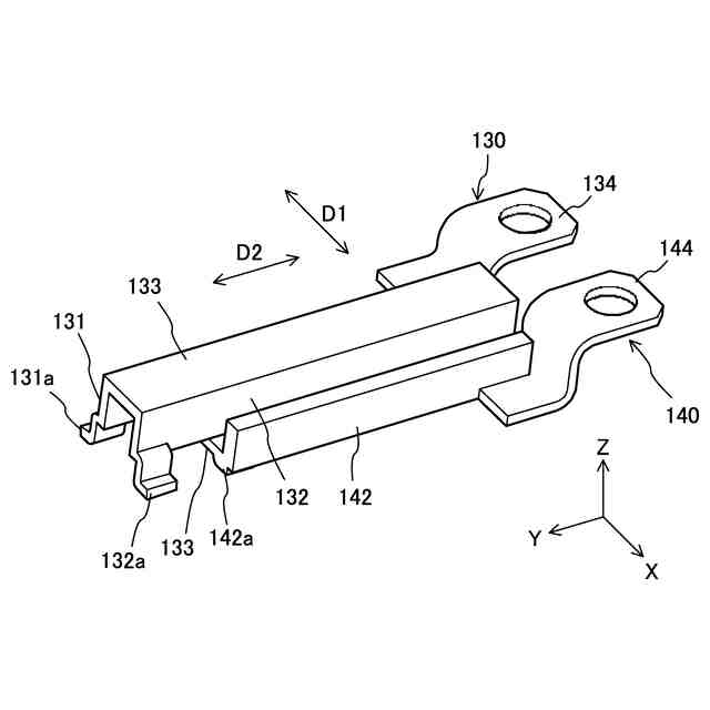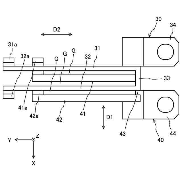 前記正極端子の複数の前記立ち上がり部と、前記負極端子の複数の前記立ち上がり部とのうち一方の複数の立ち上がり部は、前記交差する方向における前記基板とは反対側の端部において支持され、他方の複数の立ち上がり部は、前記交差する方向における前記基板側の端部において支持されている