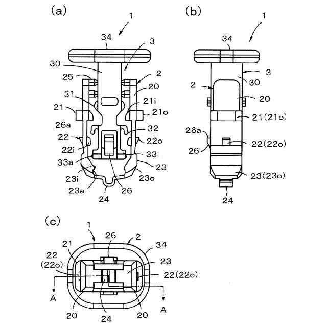 また、本発明のラッチは、プランジャー部とグロメット部は連結部により連結されており、連結部はグロメットを押し込んだときに切断されて連結が解除される。あるいは、プランジャー部とグロメット部は連結片により連結されており、連結片はグロメットを押し込んだときにグロメット部に追従して弾性変形される。
