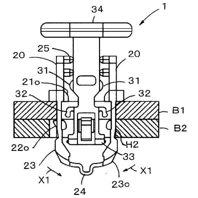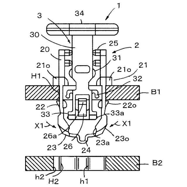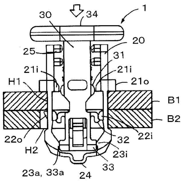 板部材を板厚方向に重ねた状態で結合するためのラッチが提案されている。特許文献1には、支柱部の一方の端部である頭部に第1板部材を固定し、支柱部の他方の端部に設けた係合部位を第2板部材の穴に係合させることにより2枚の板部材を結合するラッチが提案されている。また、特許文献2には、2枚の板部材にそれぞれ設けた係合穴に係合して2枚の板部材を結合するアンカーを備え、このアンカーの間にプッシュピンを内挿することによりアンカーと係合穴との係合状態を保持する構成が提案されている。