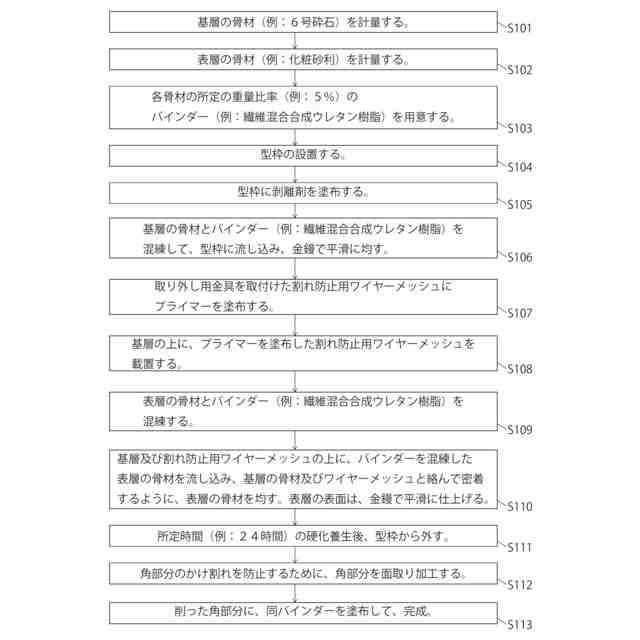 【解決手段】バインダーと混練した基層用の骨材20を、蓋の形状に合わせた型枠10に流し込んで、平滑に均す工程と、平滑に均された基層用の骨材20の上に、ワイヤーメッシュMを載置する工程と、バインダーと混練した表層用の骨材30を、基層及びワイヤーメッシュMの上に流し込んで、平滑に均す工程と、基層用の骨材20及び表層用の骨材30が硬化した後、型枠10から取り外す工程とを備え、表層用の骨材30の粒径は、基層用の骨材20の粒径よりも小さいことを特徴とする。