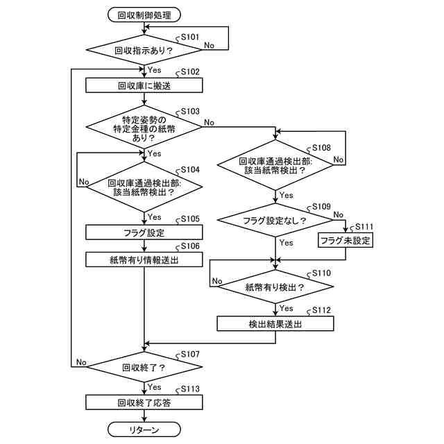 上述した目的を達成するために、本発明に係る紙幣処理装置は、上位制御部からの指示に応じて、収納庫に収納する紙幣を回収庫に搬送するユニット制御部と、前記収納庫から搬送される紙幣の金種及び姿勢を判別する判別部と、前記判別部で判別されて前記回収庫に向けて通過する紙幣の有無を検出する回収庫通過検出部と、前記回収庫における紙幣の有無を検出する回収庫検出部とを備えた紙幣処理装置であって、前記ユニット制御部は、前記判別部により前記回収庫検出部で誤検出するおそれのある特定姿勢で搬送される特定金種の紙幣が判別された場合に、該紙幣が前記回収庫通過検出部で検出されたことを条件としてフラグを設定し、前記回収庫検出部での検出結果に関わらず前記上位制御部に対して紙幣有り情報を送出することを特徴とする。