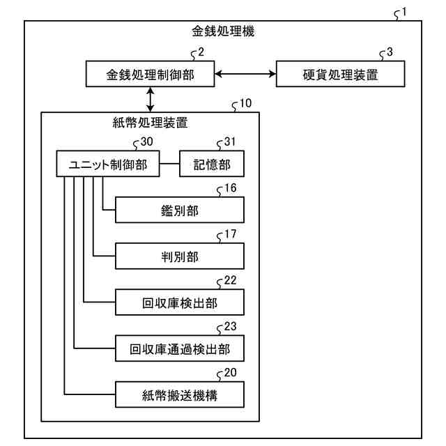 【解決手段】金銭処理制御部2からの指示に応じて、収納庫18に収納する紙幣を回収庫21に搬送するユニット制御部30と、収納庫18から搬送される紙幣の金種及び姿勢を判別する判別部17と、判別部17で判別されて回収庫21に向けて通過する紙幣の有無を検出する回収庫通過検出部23と、回収庫21における紙幣の有無を検出する回収庫検出部22とを備えた紙幣処理装置10であって、ユニット制御部30は、判別部17により回収庫検出部22で誤検出するおそれのある特定姿勢で搬送される特定金種の紙幣が判別された場合に、該紙幣が回収庫通過検出部23で検出されたことを条件としてフラグを設定し、回収庫検出部22での検出結果に関わらず金銭処理制御部2に対して紙幣有り情報を送出する。