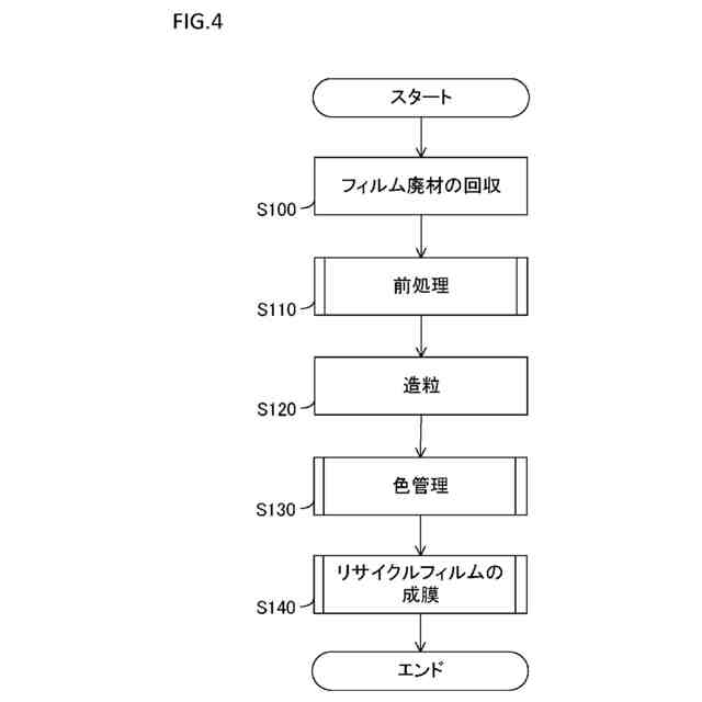このリサイクルフィルムの製造方法においては、管理情報に基づいてリサイクルフィルムが製造される。したがって、このリサイクルフィルムの製造方法によれば、再生原料の含有率とフィルムの色との関係が考慮された上でリサイクルフィルムが製造されるため、製造されるリサイクルフィルムの色を適切に管理することができる。