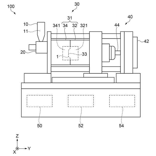 図1を含む複数の図は、互いに直交する3つの軸として、X軸、Y軸、及びZ軸を示している。X軸は、射出成形装置100の設置面に対して平行な軸である。X軸に平行な+X方向は、図1に示す射出成形装置100の奥から手前に向かう方向である。-X方向は、+X方向の反対の方向である。Y軸は、射出成形装置100の設置面に対して平行で、X軸に垂直な軸である。Y軸に平行な+Y方向は、図1に示す射出成形装置100の射出部20から型部30へ向かう方向である。-Y方向は、+Y方向の反対の方向である。Z軸は、射出成形装置100の設置面に対して垂直な軸である。Z軸に平行な+Z方向は、設置面から上方に向かう方向である。-Z方向は、設置面から下方に向かう方向である。Z軸は、射出成形装置100の設置面が水平な面である場合、鉛直方向に沿う軸である。