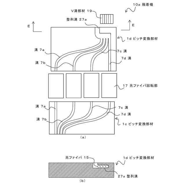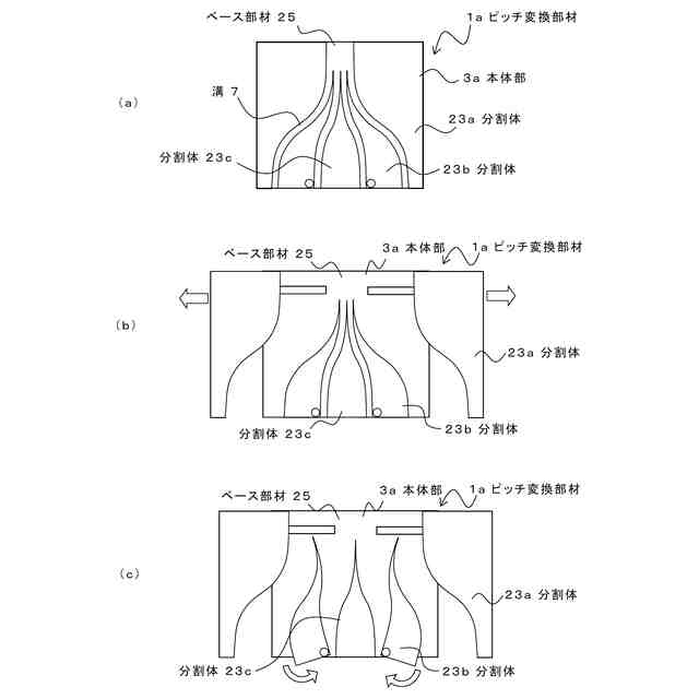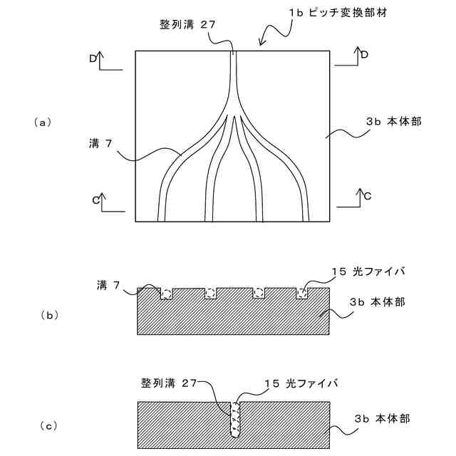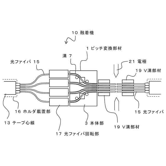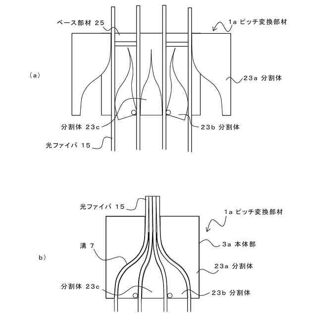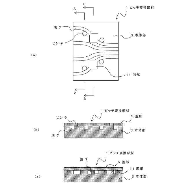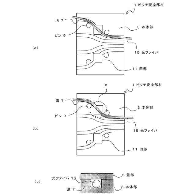 【解決手段】 ピッチ変換部材1は、上面に複数の溝7が形成された本体部3と、溝7の上方を塞ぐ蓋部5とを有する。ピッチ変換部材1は、融着機に使用され、後方から前方に対し、複数の溝7のピッチが徐々に狭くなるように変化させることで、溝7に収容される複数の光ファイバのピッチを規制するための部材である。それぞれの溝7は、後方から前方に向けて、なだらかな曲線状に形成される。