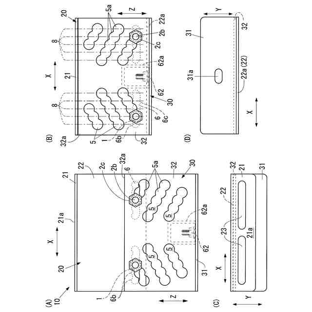 前記連続穴は、前記ベース側平板部と前記受側平板部のうちの前記一方の面内方向に斜めに延び、