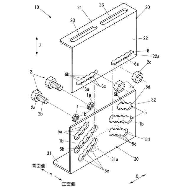 【解決手段】軸部2bを有する締結具2と、軸部を通す軸穴1aを有するずれ防止片1と、上下方向に延在する受側平板部22を有する受材20と、上下方向Zに延在するベース側平板部32を有するベース材30とを備える。締結具は、重ね合わせられた2つの平板部22,32に軸部2bを通して連結する。2つの平板部22,32のうちの一方は連結した複数の位置決め穴5aで形成された連続穴5を有し、他方は軸部を通す通し穴6を有する。連続穴5の最小の幅は、軸部2bの直径よりも大きい。複数の位置決め穴は上下方向に異なる位置に形成され、各位置決め穴は、ずれ防止片1の外周の少なくとも一部が嵌合できるように形成されている。ずれ防止片は、締結具が2つの平板部22,32を連結するときに、軸部2bが軸穴に通った状態で位置決め穴5aに嵌まる。