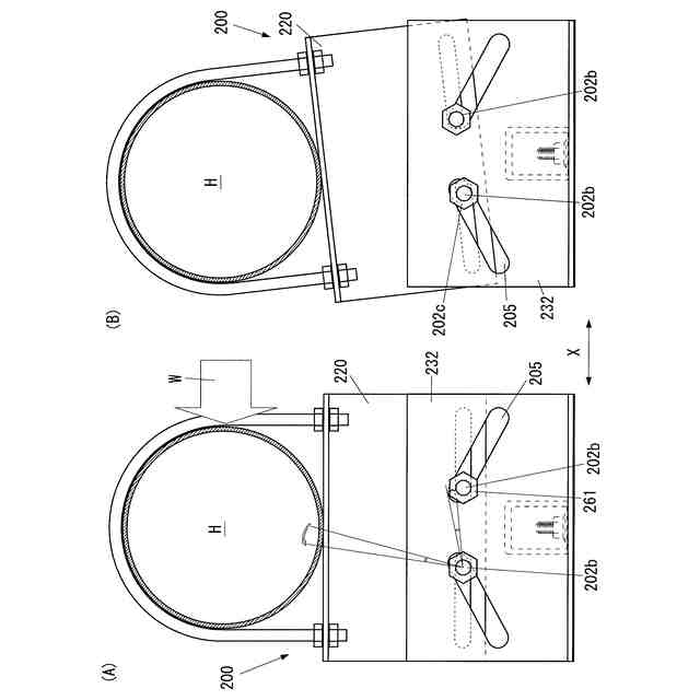それ以上の高さまで支持架台103を持ち上げたい場合には、図1(D)と図1(E)のように、配管Hと支持架台103の間にスペーサー108を挿入する。このスペーサー108は、配管Hの側面に沿う窪みを有しており、その窪みに配管Hを嵌めて配管Hを安定させるものである。