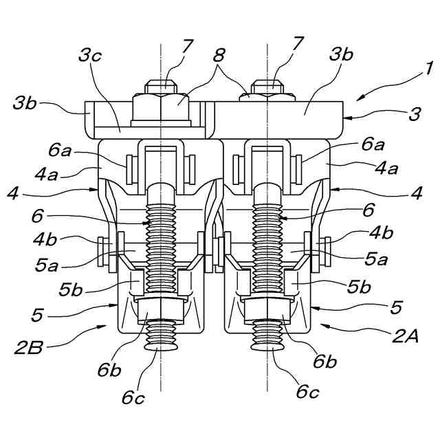 勿論、上記のような受け部材の不測の回転防止策としては、上記段落0008に記載の構成を採用する場合、前記ベース部材(3)の両端張出し部(3c)には、この両端張出し部(3c)の上に支持されるパイプクランプ(2A,2B)の前記受け部材(4)の底辺部(4a)の側辺に沿って隣接する立上り板部(17a,17b)を形成しておくことができる。この構成によれば、前記立上り板部によってパイプクランプ(受け部材)の不測の回転を確実に防止することができ、しかもパイプクランプとベース部材の両方に加工が必要な構成と比較して安価に実施することができる。