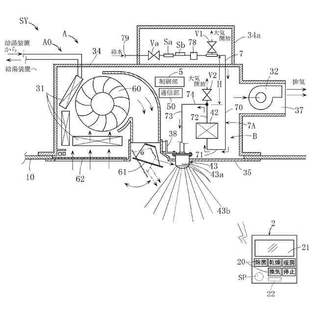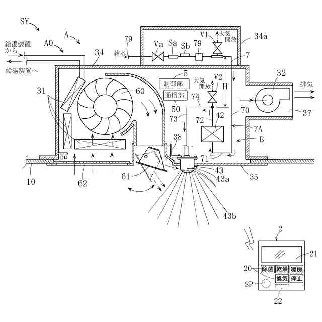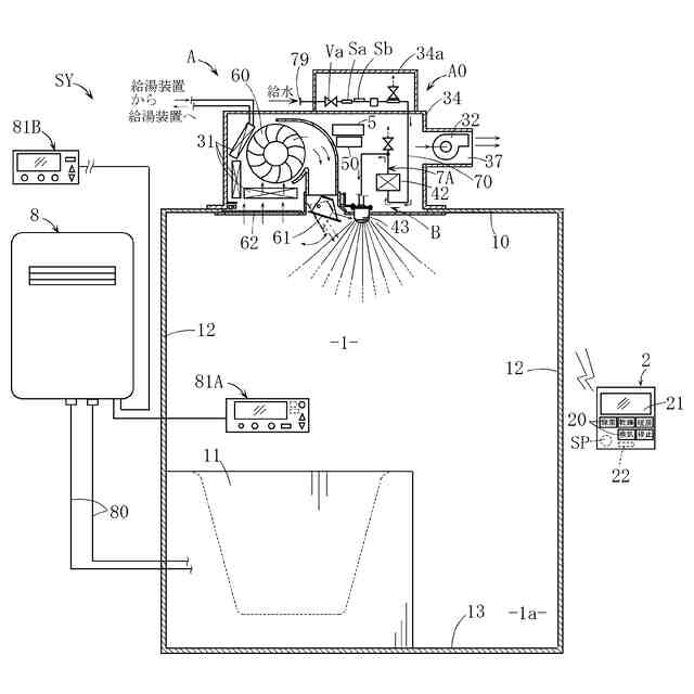 【解決手段】浴室用の除菌水散布装置Bは、一端側が入水側とされ、かつ他端側には浴室1への散水用のノズル43が設けられている流水路7と、この流水路7に供給された非除菌水としての水が流入するチャンバ42aを有し、かつこのチャンバ42aに流入した水から除菌水を生成してノズル43側に流れさせることが可能な除菌水生成装置42と、を備えており、流水路7は、この流水路7への入水停止状態時に、水または除菌水が滞留する封水部7Aを備えており、除菌水生成装置42のチャンバ42aは、封水部7Aに設けられて封水部7Aの少なくとも一部を構成している。