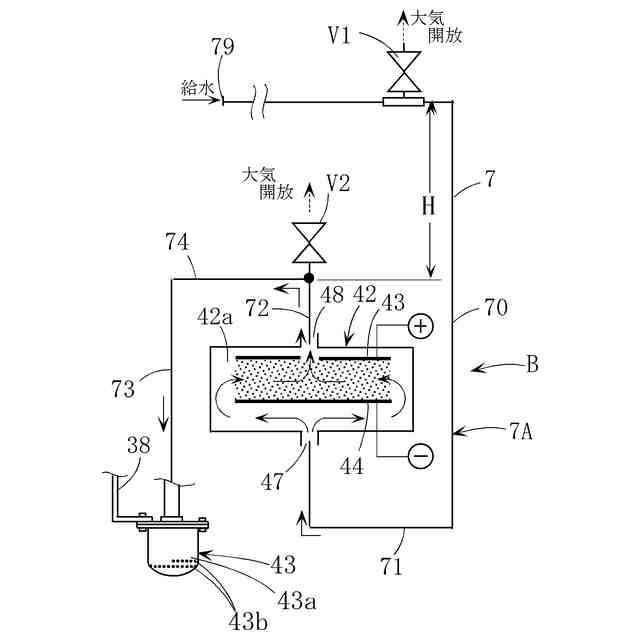 一方、除菌水散布装置の運転停止時には、前記流水路やオゾン水生成装置への入水は停止されており、オゾン水生成装置のチャンバには水がなく、全体または一部が乾いた状態となる場合がある。ところが、そのような状態になると、水中のミネラル成分などがチャンバ内において析出し、この析出物質に起因してチャンバに詰まりを生じたり、あるいは電極表面が析出物質によって覆われ、オゾン水生成の性能低下を生じるなどの不利をきたす虞がある。このような虞は適切に解消されることが望まれる。