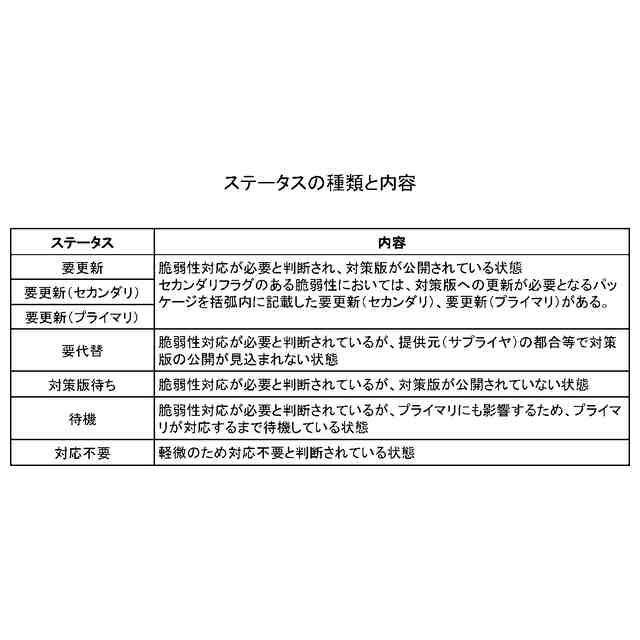 また、ソフトウェアの構成要素のうち、OSSのように他者から提供されるソフトウェアについては、提供元(サプライヤ)による脆弱性に対する対策(バージョンアップ等)の状況を随時把握し、脆弱性について対策するためのソフトウェア(以下、「対策版」と称する。)の提供を待機するか、又は対策版の取得を断念して脆弱性について対策することが可能な他のソフトウェアへの代替の検討を行うかといった様々な対応方法を迅速に検討する必要があり、ソフトウェアの運用現場においては、そのための情報収集や判断のために多くの負担が生じている。