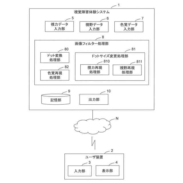 【解決手段】 視覚障害体験システム1は、ユーザが体験する視覚障害の視力に関する情報(視力データ)が入力される視力データ入力部5と、ユーザが体験する視覚障害の視野に関する情報(視野データ)が入力される視野データ入力部6と、視力データおよび視野データに基いて、所定の入力画像を視覚障害体験画像に変換する画像フィルター処理を行う画像フィルター処理部8を備える。画像フィルター処理部8は、入力画像を構成する画素である複数のピクセルを、視覚障害体験画像を構成する画素である複数のドットに変換する処理を行うドット変換処理部80と、視力データおよび視野データに基いて、視覚障害体験画像のドットのサイズを変更する処理を行うドットサイズ変更処理部81を備える。