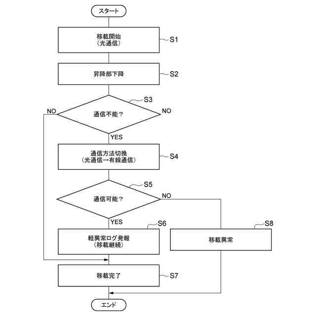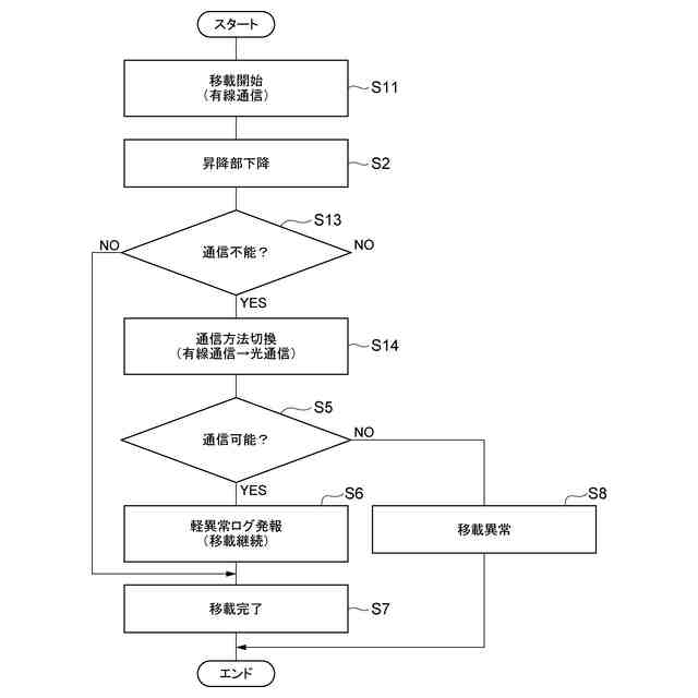 (3)上記(2)に記載の天井搬送車では、無線通信装置は、本体部と昇降部とにおいて対向するように配置された端末を介して光通信する光通信装置であってもよい。この構成では、無線通信装置として光通信装置を用いることができる。