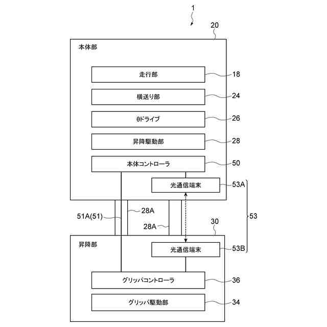 前記本体部に設けられる本体部側コントローラと、前記昇降部に設けられ、前記保持部の駆動を制御する昇降部側コントローラとの間で通信をするための、複数の通信装置と、