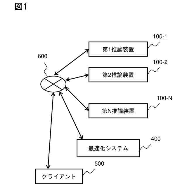図1は、実行ハードウエア決定システム400を含む全体構成図である。実行ハードウエア決定システム400は、第1推論ハードウエア100-1、第2推論ハードウエア100-2、・・・、第N推論ハードウエア100-N、およびクライアント500とネットワーク600を介して接続される。以下では、第1推論ハードウエア100-1、第2推論ハードウエア100-2、・・・、および第N推論ハードウエア100-Nをまとめて推論ハードウエア100と呼ぶ。それぞれの推論ハードウエア100は、ハードウエア構成、電力構成比、および電力定格の少なくとも1つが異なる。それぞれの推論ハードウエア100は、同一のデータセンターに配置されてもよいし、異なるデータセンターに配置されてもよい。