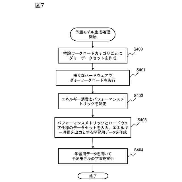 エネルギー予測モデルに前記ユーザクエリに基づく前記標準モデルのパフォーマンスメトリックおよび前記候補ハードウエアの制約を入力し、前記候補ハードウエアにおけるエネルギー消費量を得る試算処理と、