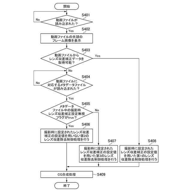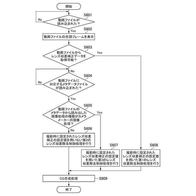 RAW動画ファイルの表示には現像処理が必要となるが、カメラメーカー製のアプリケーション以外にも、一般的な編集システムが各カメラメーカーのRAW動画現像に対応している場合がある。例えば、Blackmagic Design社のDaVinci Resolveでは、様々なカメラメーカーのRAW動画現像に対応している。ただし、編集システムは、RAW動画ファイルの現像処理において、カメラメーカー製のアプリケーションから出力されたメタデータファイルを解析できず、このメタデータファイル内のレンズ収差補正の設定値に従ってレンズ収差補正を適用できない場合がある。このため、ユーザが撮影時に或るレンズ収差補正を適用する設定を行っていても、編集システムによる現像結果ではこのレンズ収差補正だけでなく、他のレンズ収差補正も適用されない。これにより、メタデータファイルのレンズ収差補正の設定値と、編集システムによって出力された動画ファイルのレンズ収差補正の適用状態とが一致せず、CG合成前の動画ファイルを、全てのレンズ収差を除去した状態にすることができないという問題が生じる。