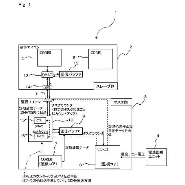 【解決手段】制御マイコン2と監視マイコン3との間で通信を行なう際に、送信側となる監視マイコン3は、SPI11、送信バッファ9からSPI11へのDMA転送を行うDMAC10を備える。監視マイコン3で送信処理を行なう送信コア7は、送信バッファ9に送信データを書き込むと共にDMAC10にDMA転送を開始させる。監視コア8は、DMAC10がDMA転送を行っている期間中に監視の結果により制御マイコン2に緊急に送信すべき重要データが発生すると、DMA転送を一旦中断させて重要データをSPI11に転送し、その後にDMA転送を再開させる。