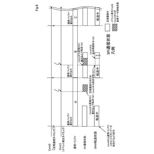 また、マイコンリソースの制約により、通信線を増して対応する選択肢はとれず、且つ送信コアによる定期通信の間隔も維持することを考える。監視コアが異常発生の通知データを送信するため、送信コアとスピンロック方式等によってコア間同期をとった上で、送信コアに通知データを送信させるとする。この場合、コア間同期を開始した時点で送信コアが定期通信を行なっていると、通知データを次の周期の定期通信で送信せざるを得ず、異常発生の通知が大きく遅延することになる。