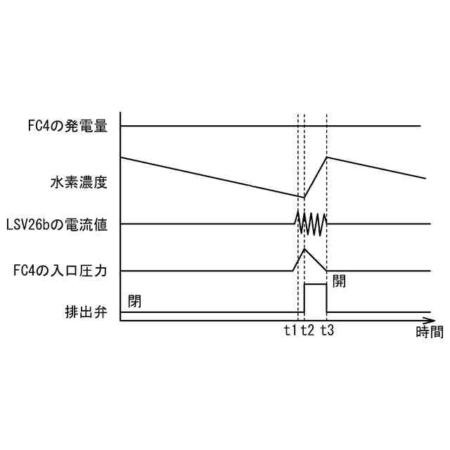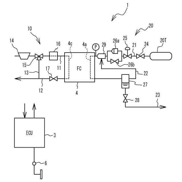 FC4は、酸化剤ガスと燃料ガスの供給を受けて発電する固体高分子電解質型の単セルが複数積層されている。FC4内には、酸化剤ガスが流れるカソード流路4cと、燃料ガスが流れるアノード流路4aとが形成されている。単セルは、膜電極接合体とそれを挟持するカソード側のセパレータとアノード側のセパレータとから構成される。カソード流路4cは、主に膜電極接合体とカソード側のセパレータとの間で画定され、酸化剤ガスが流通可能な空間である。アノード流路4aは、膜電極接合体とアノード側のセパレータとの間で画定され、燃料ガスが流通可能な空間である。膜電極接合体は、電解質膜と、電解質膜の両面にそれぞれ形成された触媒層とを含む。
