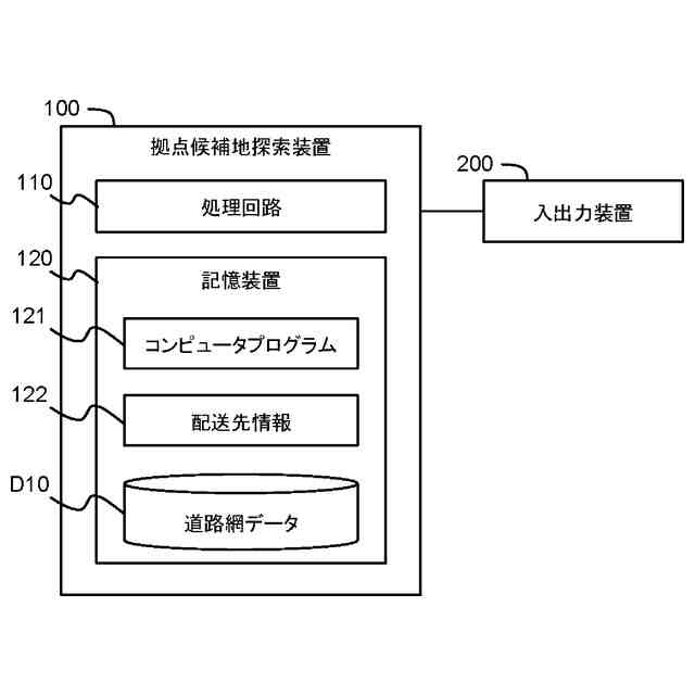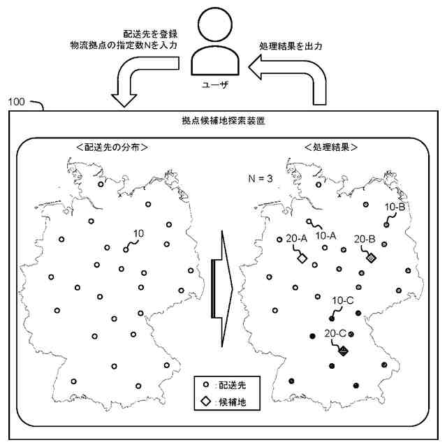 図1は、本実施形態に係る拠点候補地探索装置100の概要を説明するための概念図である。拠点候補地探索装置100は、ユーザから配送先10の登録を受け付ける。配送先10は、物流拠点から荷物が配送される地点である。配送先10は、例えば、配送された商品を販売する店舗である。ただし、配送先10の種類は特に限定されない。例えば、配送先10は、工場、倉庫、住居、等であってもよい。ユーザによる配送先10の登録において、拠点候補地探索装置100は、少なくとも、登録される配送先10の地図上の位置の情報を取得する。拠点候補地探索装置100は、さらに、登録される配送先10に所定期間毎(例;日毎、週毎、月毎)に配送される荷物量の情報を取得してもよい。図1には、登録された地図上の複数の配送先10の分布が示されている。図1において、配送先10の符号は、1つを除いて省略している。