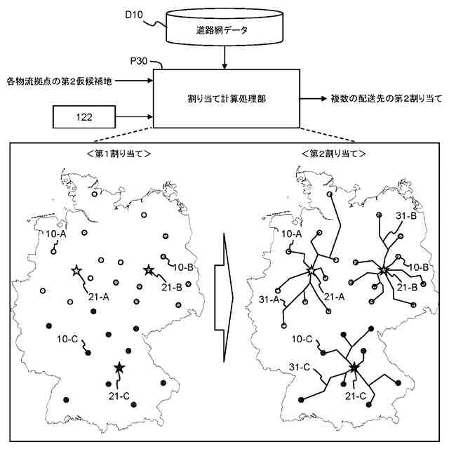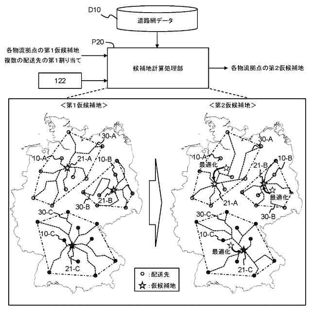 前記N個の物流拠点ごとに、前記第1仮候補地と前記道路網データとに基づいて前記第1割り当てにおいて割り当てられている配送先までの事前ルートの平均距離又は加重平均距離を最小化する第2仮候補地を計算する候補地計算処理を実行し、