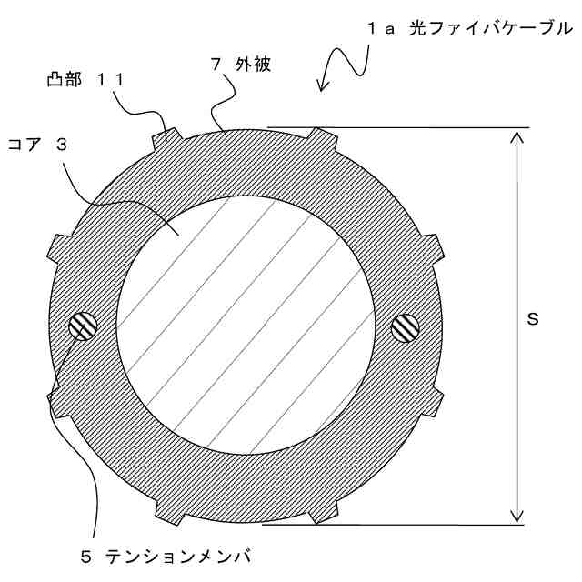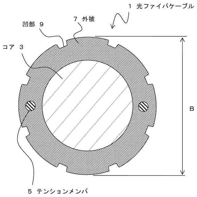 図14は、従来の光ファイバケーブル100を示す図である。光ファイバケーブル100は、コア103とテンションメンバ105が外被107で覆われ、前述したように、外被107の外周に周方向に凸部111と凹部109が交互に形成される。すなわち、凸部111の間が凹部109となる。