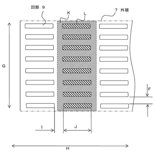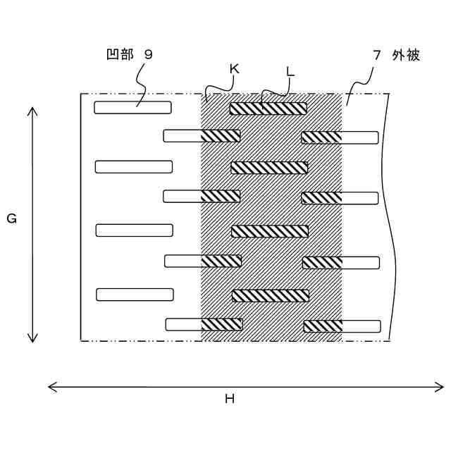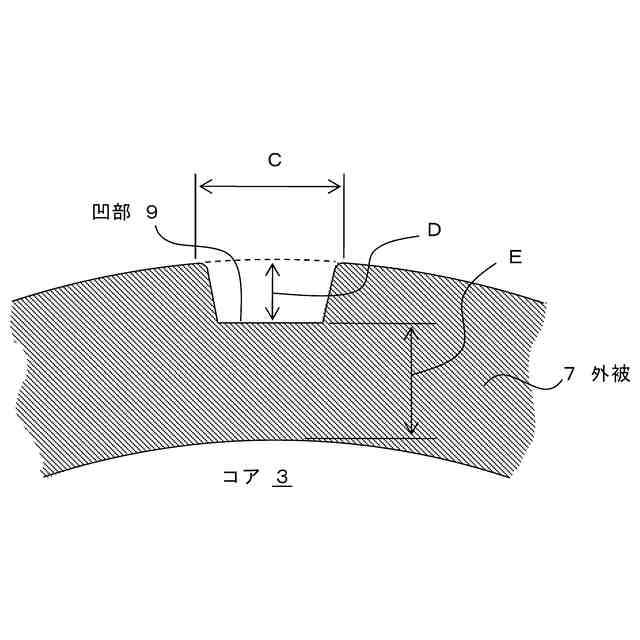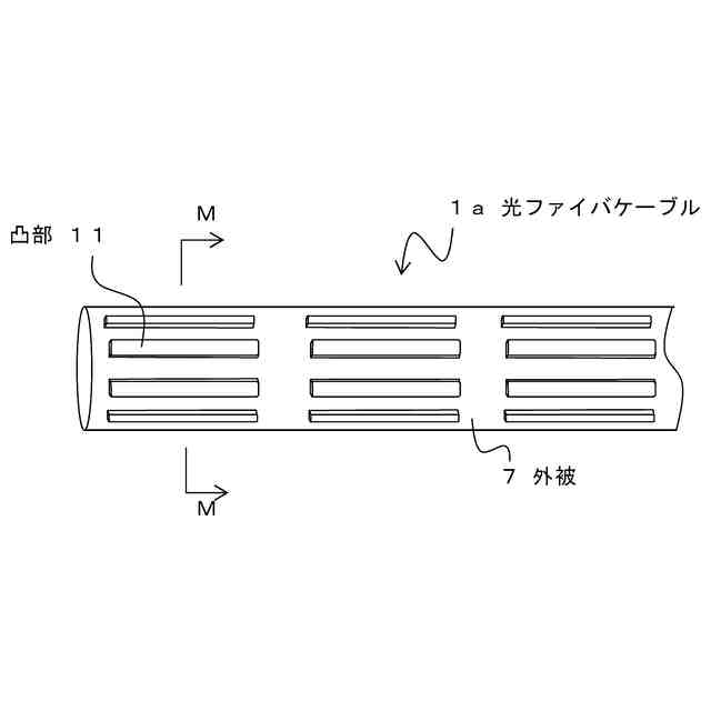 ここで、凸部111を除く凹部109は、略円形であり、凸部111は、この円形の外周部に突出するように形成される。このため、凸部111と凹部109との境界部(凸部111の基部)には、隅角部(図中X)が形成される。このような隅角部(凹方向と凸方向の異なる方向の曲線の交差部又は曲率の大きな変化部)には、光ファイバケーブルを曲げた際などに応力集中が生じやすい。このため、隅角部が長手方向に連続すると、光ファイバケーブルの破損の要因となる。