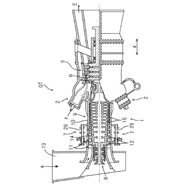 図1は、本開示の可変静翼機構を採用したガスタービンエンジンGTの発電システムの概略構成を示す。同図において、ガスタービンGTは、軸流圧縮機(以下、単に「圧縮機」という)1と、燃焼器2と、タービン3とを主な構成要素として備えている。圧縮機1から供給される圧縮空気Aと、図示外の燃料供給装置から供給される燃料Fとを燃焼器2で燃焼させ、燃焼により発生する高温高圧の燃焼ガスGをタービン3に供給して、タービン3を駆動する。タービン3から排ガスEが排出される。圧縮機1は回転軸4を介してタービン3により駆動され、タービン3はまた、減速機5を介して発電機のような外部の負荷6を駆動する。