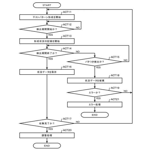 【解決手段】 実施形態の画像形成装置は、制御部、第1のセンサ、判定部、検出部及び決定部を備える。制御部は、予め定められた形状のパッチをそれぞれ重ならないように形成することで複数のパッチからなるテストパターンを形成するように複数の形成部を制御する。第1のセンサは、像担持面に対向して配置され、像担持面に付着しているトナーを検出する。判定部は、複数の形成部によりそれぞれ形成されたテストパターンの形成状況を、第1のセンサによる検出結果に基づいて判定する。検出部は、第1のセンサの対向位置での像担持面のバタつきを検出する。決定部は、検出部によりバタつきが検出されることのないままに判定部により判定された形成状況に基づいて、複数の形成部それぞれでの要素像の形成条件を決定する。