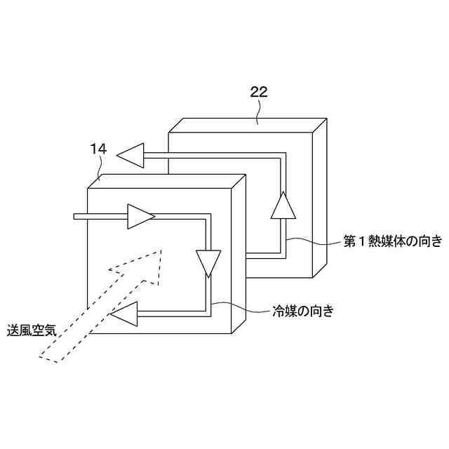 ヒータコアにおける第1熱媒体の流れ方および室内凝縮器における冷媒の流れ方を説明するための説明図である。