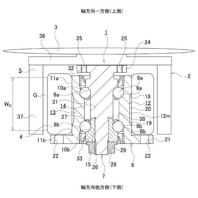 前記軸受は、前記静止体の内周面と前記回転体の外周面との間に、軸方向に離隔して配置された1対の単列玉軸受により構成される。前記1対の単列玉軸受を構成するそれぞれの単列玉軸受は、外輪と内輪と玉とを備え、前記外輪の外周面を前記静止体の内周面に内嵌し、かつ、前記内輪の内周面を前記回転体の外周面に外嵌する態様で、前記静止体と前記回転体との間に組み付けられる。
