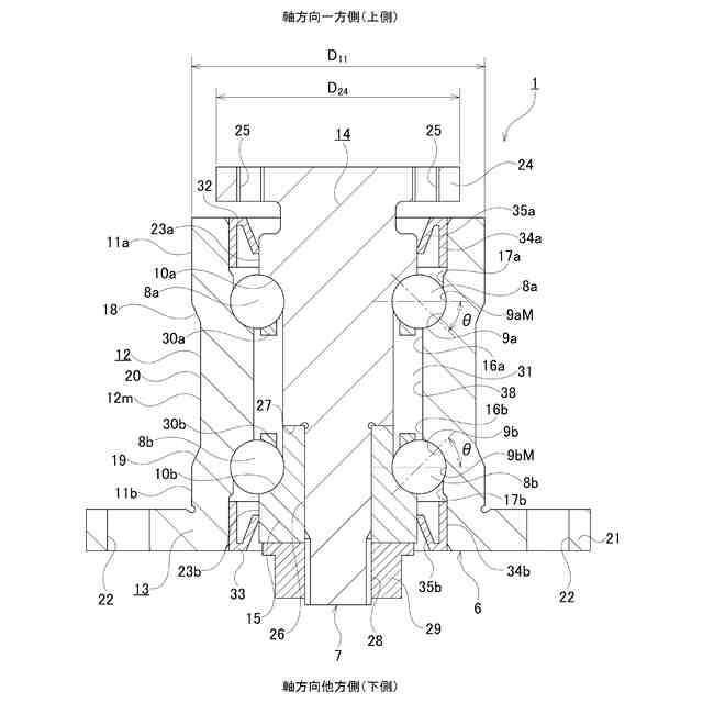 【解決手段】内周面に複列の外輪軌道9a、9bを有し、モータステータを支持可能な静止体6と、外周面に複列の内輪軌道10a、10bを有し、モータロータおよびプロペラを支持可能な回転体7と、複列の外輪軌道9a、9bと複列の内輪軌道10a、10bとの間に、それぞれの列ごとに複数個ずつ配置された転動体8a、8bとを備える。