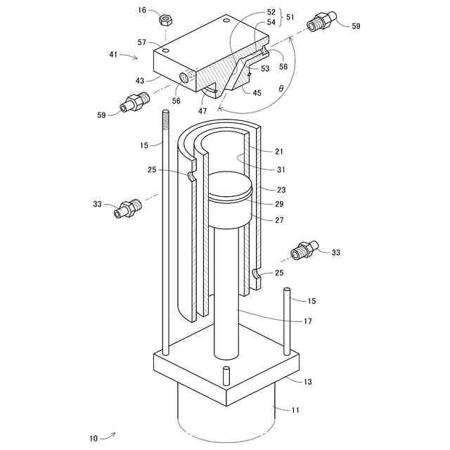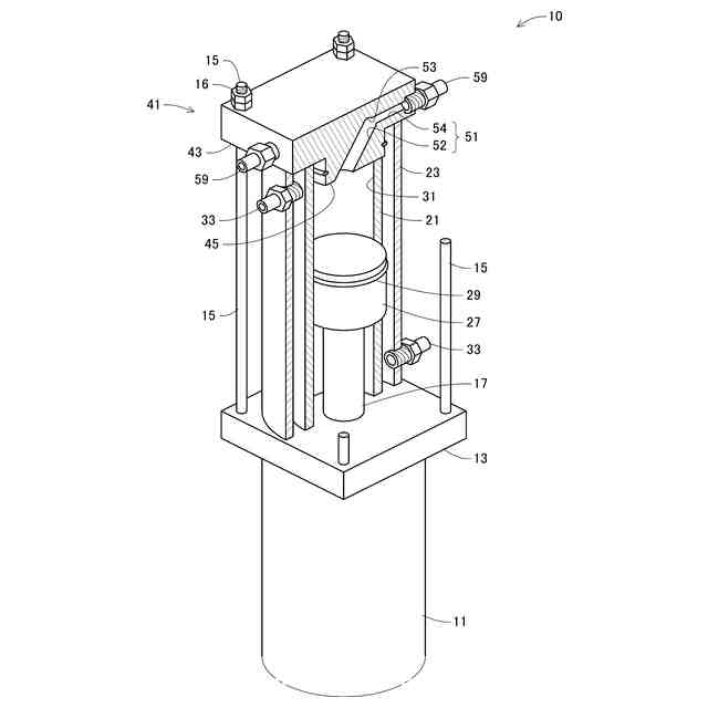 シリンダ室31を有するシリンダ21と、シリンダ21の内部を往復するピストン27と、シリンダ21の一端面を塞ぐヘッドカバー41と、を有する。ヘッドカバー41は、シリンダ室31に開口する内方区間52と、内方区間52に接続してヘッドカバー41の側面に開口する外方区間54と、を含む流路51を有する。内方区間52と外方区間54のなす角を鈍角とすることで、内方区間52と外方区間54の交点に形成されるエッジ部分の鋭さが緩和され、応力が過大になることを抑制できる。